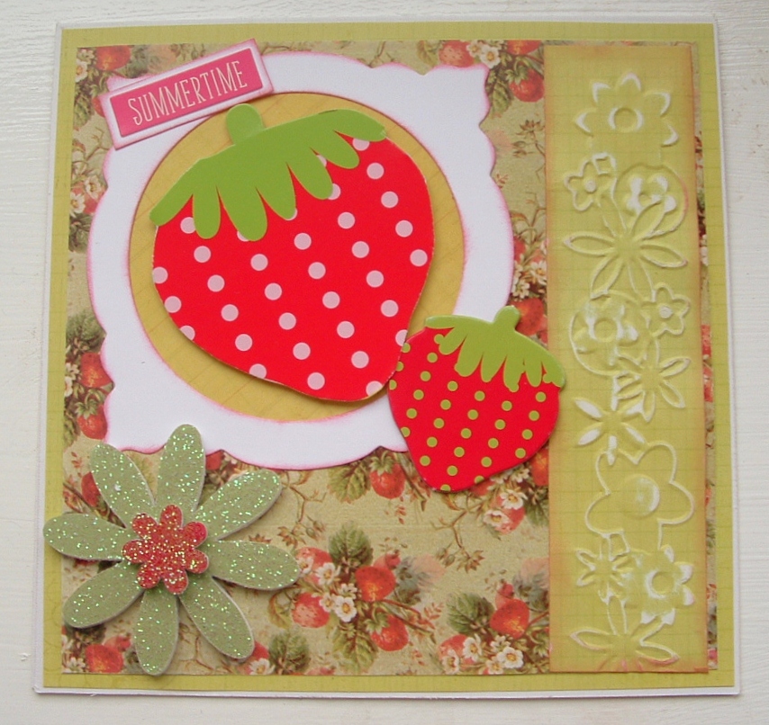 Hi morning I have a new card design to share with you all, for this card I have used a cuttlebug embossing folder, some summer strawberry themed paper, and a couple of die cut chipboard shapes.